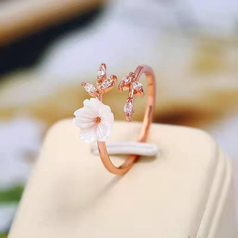 Rose Gold Color Twig Shell Flowers Cherry Blossom Adjustable Open Rings Branches Leaves Inlaid With Zircon Ring For Women