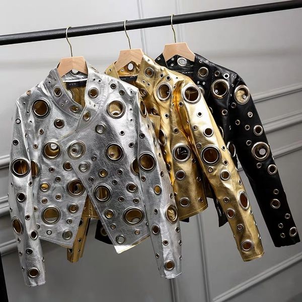 women's leather & faux korean autumn women short big hole hollow out metal wind all matched pu jacket coat fashion streetwear 2021, Black