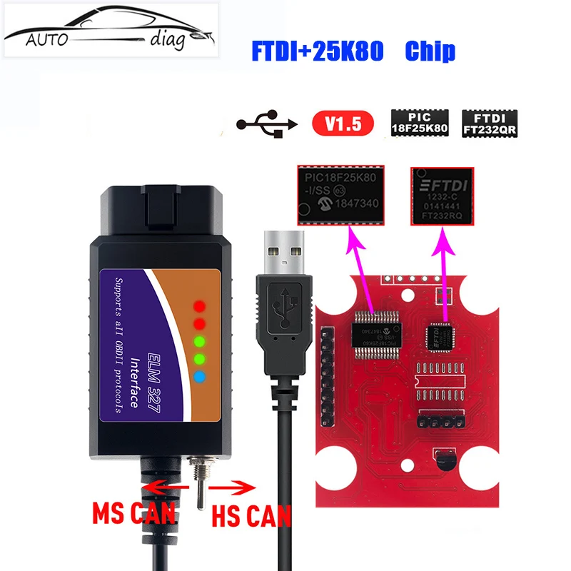 Бесплатная доставка ELM327 USB FTDI OBDII сканер кодов с переключателем PIC18F25K80 ELM327 USB V1.5 OBD2 автомобильный диагностический сканер