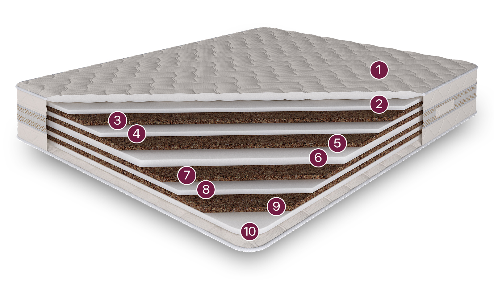 Чехол . Тип ткани: жаккард или трикотаж. Состав ткани: 50% хлопок, 50% полиэстер. Наполнитель: гипоаллергенное волокно холфитекс. . Ортопена высокой плотности. Страна-поставщик: Германия . Ортопена - пенополиуретан, обладающий модернизированной структурой, более высокими параметрами. Благодаря новой технологии изготовления, обыкновенный пенополиуретан смог стать упругим, жаростойким, плотным материалом. Ортопена в своем составе содержит более 90% процентов воздуха. Это смягчающий и опорный материал, который обладает эластичностью и упругостью. Она не крошится, не слёживается, отсутствует проминание. Абсолютно безопасна и гипоаллергенна.. . Кокосовая койра латексированная. Страна-поставщик: Словения. Экологически чистый, долговечный природный материал, получаемый из межплодника ореха кокосовой пальмы, произрастающей в тропических районах Юго-Восточной Азии. Будучи натуральным материалом, койра, тем не менее, не вызывает аллергических реакций, и наоборот, выросшее под солнцем тропиков, кокосовое волокно впитало в себя огромный запас энергии, которая создает на много лет мощное благотворное биополе. В качестве наполнителя для матрасов кокосовая койра обеспечивает оптимальную упругость и долговечность матраса. Для устранения ломкости и увеличения срока эксплуатации, кокосовое волокно пропитывают латексом. На выходе получается монолитная плита: прочная и долговечная. Латексная пропитка позволяет выдерживать большие нагрузки и препятствует деформации и расслаиванию наполнителя.. . 1. Несъёмный чехол из трикотажа или жаккарда. 2. Ортопена высокой плотности — 2 см.. 3. Кокосовая койра латексированная — 2 см.. 4. Ортопена высокой плотности — 2 см.. 5. Кокосовая койра латексированная — 2 см.. 6. Ортопена высокой плотности — 3 см.. 7. Кокосовая койра латексированная — 2 см.. 8. Ортопена высокой плотности — 2 см.. 9. Кокосовая койра латексированная — 2 см.. 10. Ортопена высокой плотности — 2 см.