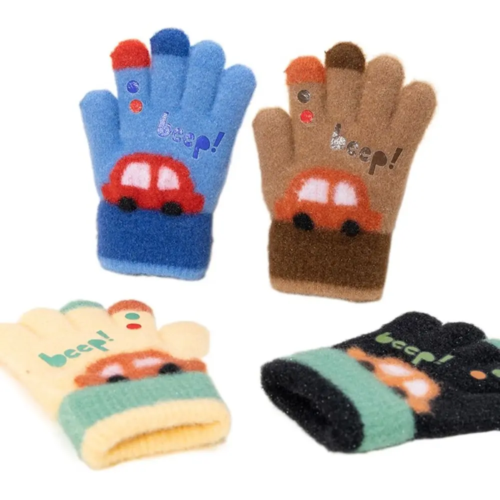 Зимние вязаные перчатки с рисунком автомобиля 3-6 лет, теплые эластичные перчатки с пятью пальцами, милые толстые детские перчатки, осень-зима