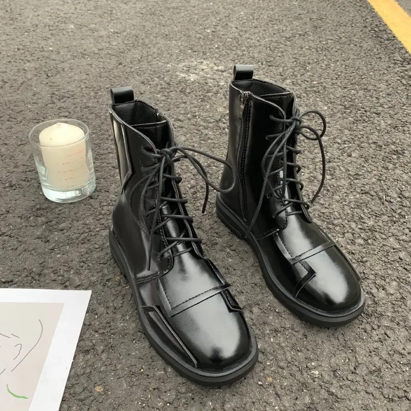 2020 new design fashion boots with pocket lace up mid calf women boots popular female shoes, Black/beige