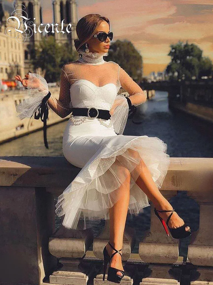 Элегантное и шикарное белое платье VC, женское платье миди с высокой талией и поясом, вечернее платье