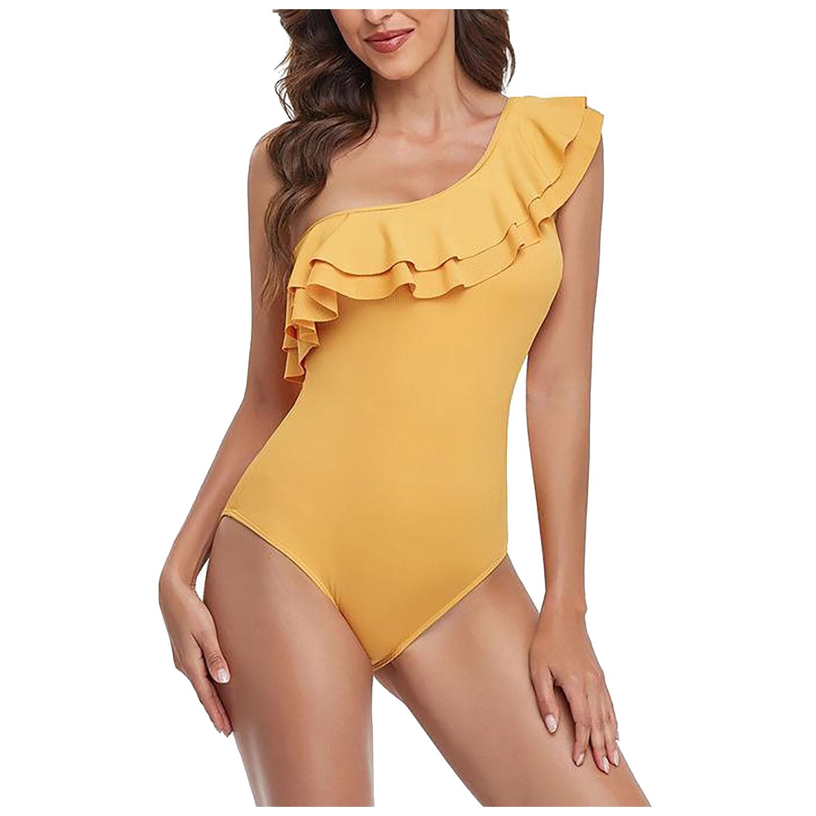 Бикини, летняя мода, приталенный однотонный цельный купальник с рюшами и открытыми антиклинальными краями на одно плечо XXL жёлтый
