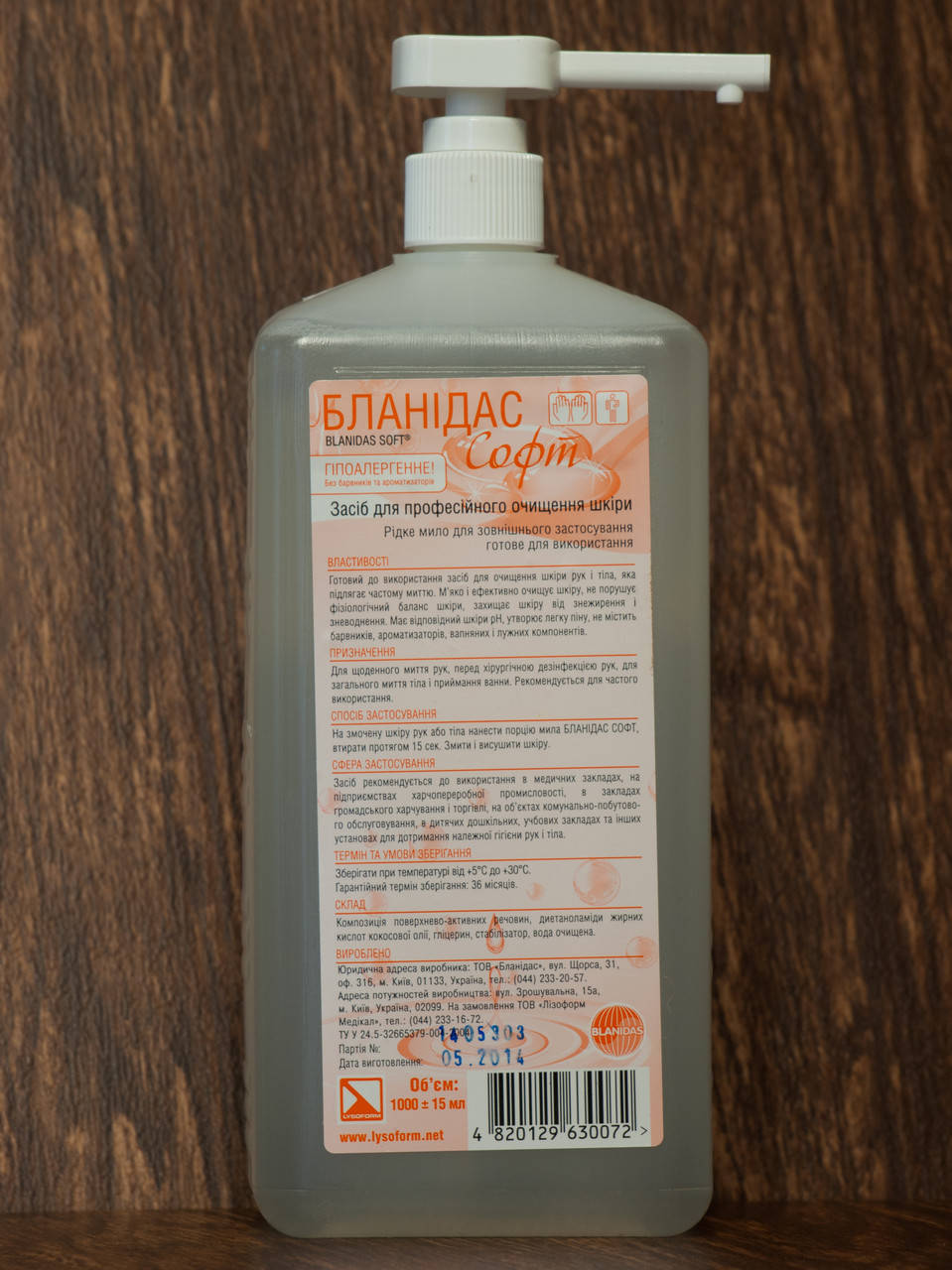 Жидкое мыло, не имеет цвета, резкого запаха, без щелочи и других вредных компонентов. «Бланидас софт» может использоваться в качестве геля для душа или шампуня. Мягко и эффективно очищает кожу, предотвращает ее обезвоживание. При намыливании создает легкую неплотную пену, которая легко смывается. Гипоаллергенное. Рекомендуется для частого использования. Упаковано в пластиковый флакон с дозатором.