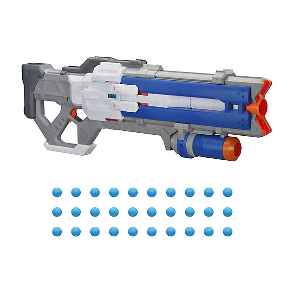 Бластер является репликой оружия из популярной компьютерной игры Overwatch. Зарядите его шариками и включите двигатель, удерживая кнопку ускорения. Нажмите на курок, чтобы начать стрельбу. Также имеется предохранитель, предотвращающий случайный выстрел. При запуске активируется подсветка и эффект отдачи.