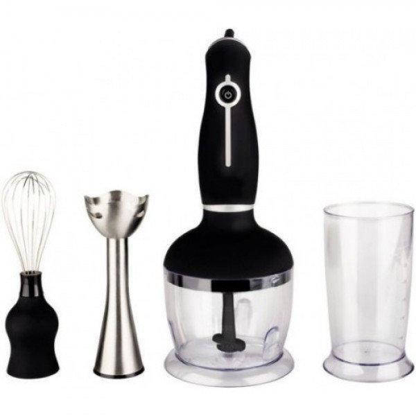 В комплект входит насадка венчик, насадка блендер и насадка измельчитель), моторная часть и пластикoвый стакан.