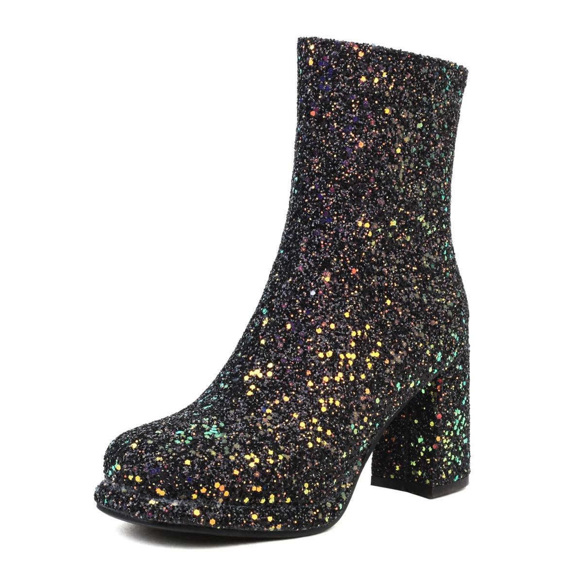 Блестящие Золотые Серебряные Ботильоны из Ткани с Пайетками Женские Высокие Массивные Каблуки Белые Блестящие Вечерние Платья Леди Зимние Ботильоны на Молнии 46