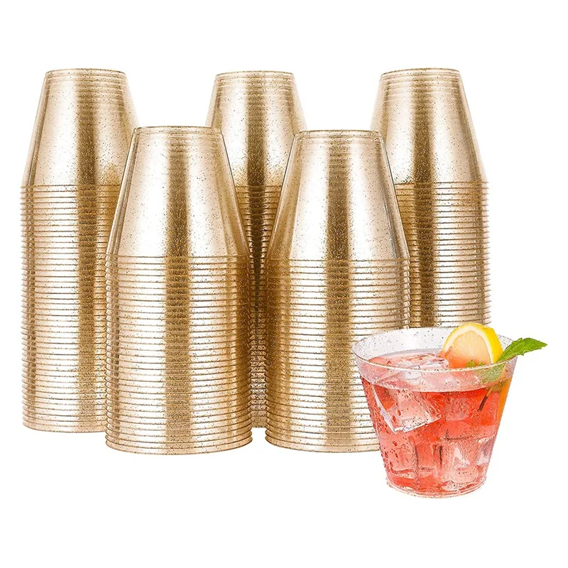 Блестящие Золотые пластиковые чашки, одноразовые золотые бокалы для вина, прозрачные пластиковые бокалы, золотые блестящие бокалы