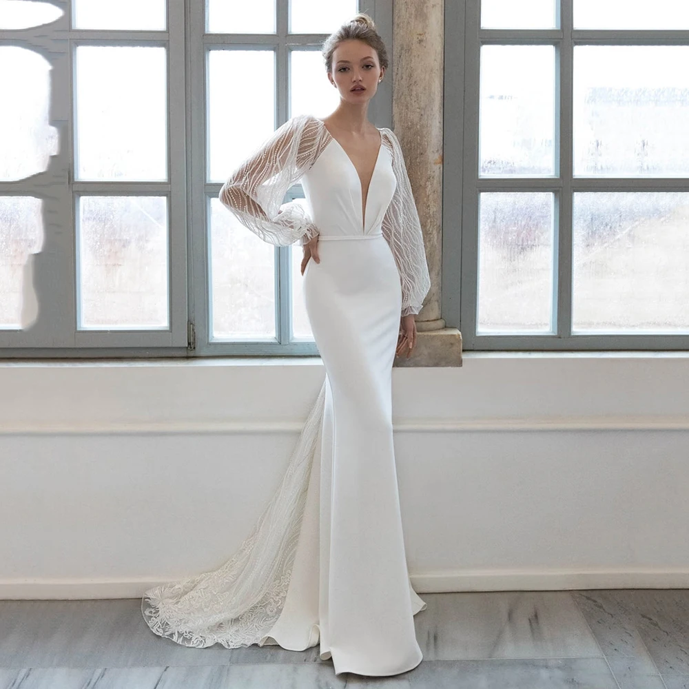 Блестящие кружевные свадебные платья UETEEY, платья невесты с глубоким V-образным вырезом, плиссированными длинными пышными рукавами и юбкой-г...