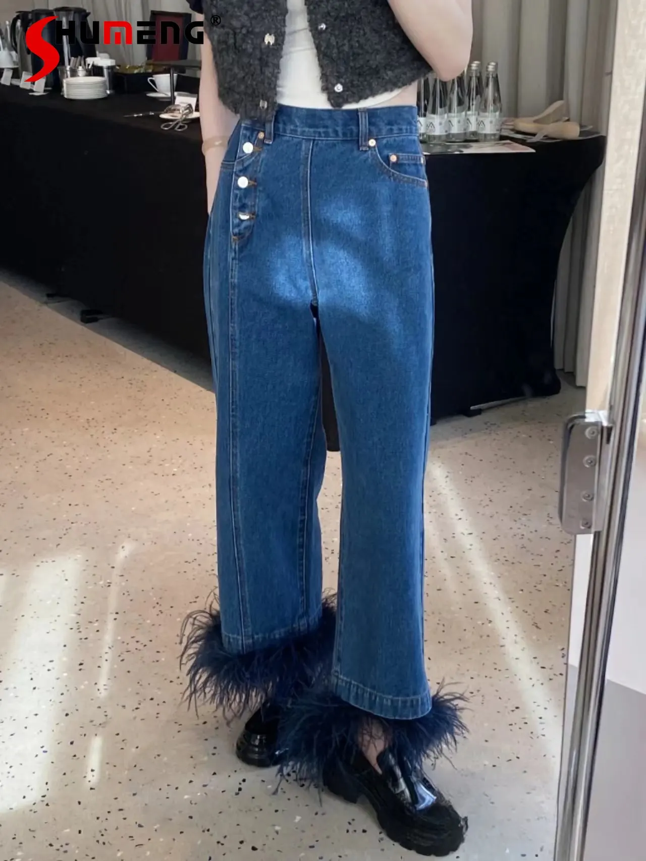Джинсы женские Асимметричные со съемными страусиными перьями и высокой талией