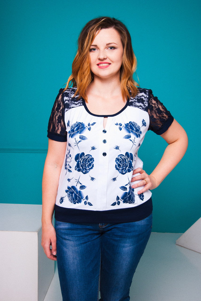 [html]Летняя женская блуза выполнена из легкой качественной турецкой ткани. Спереди красивый оригинальный авторский принт Розы, по центру симметричная склада декорирована пуговками. Круглый вырез горловины со сборкой и по центру капелька. Короткий кружевной рукав. Блуза прекрасно подходит на каждый день при этом выглядит эффектно и нарядно.Материал - вискозаРазмер - 50, 52, 54, 56, 58Цвет - синий, белыйРазмер модели 50, рост 171 см. [/html]