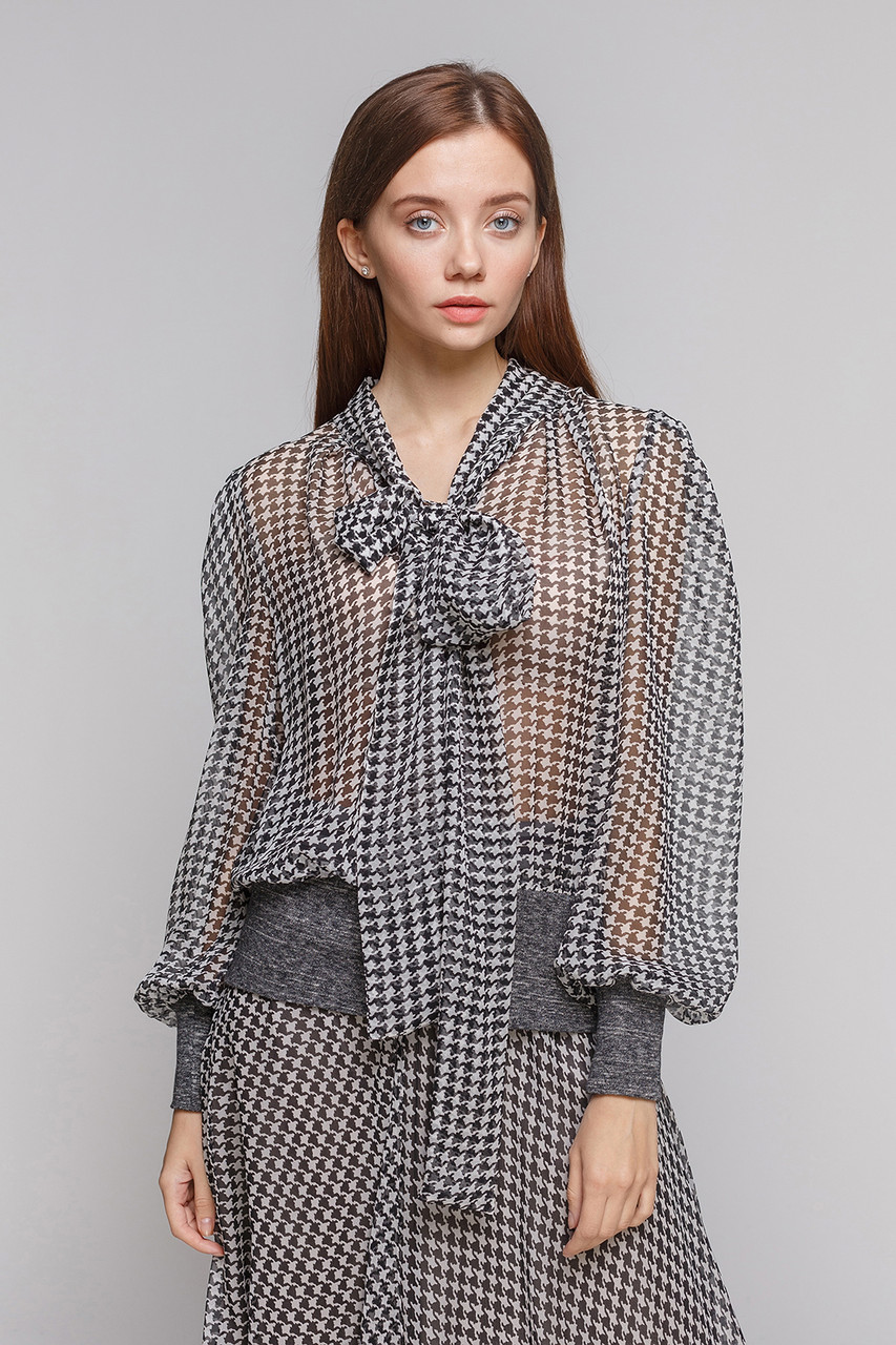[html]Блуза Лузиана - невесомая блуза в французском стиле с романтичным бантом. Крой свободный. Для нежных, романтических девушек. С трикотажными вставками на спинке, поясе и рукавах! Состав: 100% шелк, 95% шерсть, 5% эластан [/html]