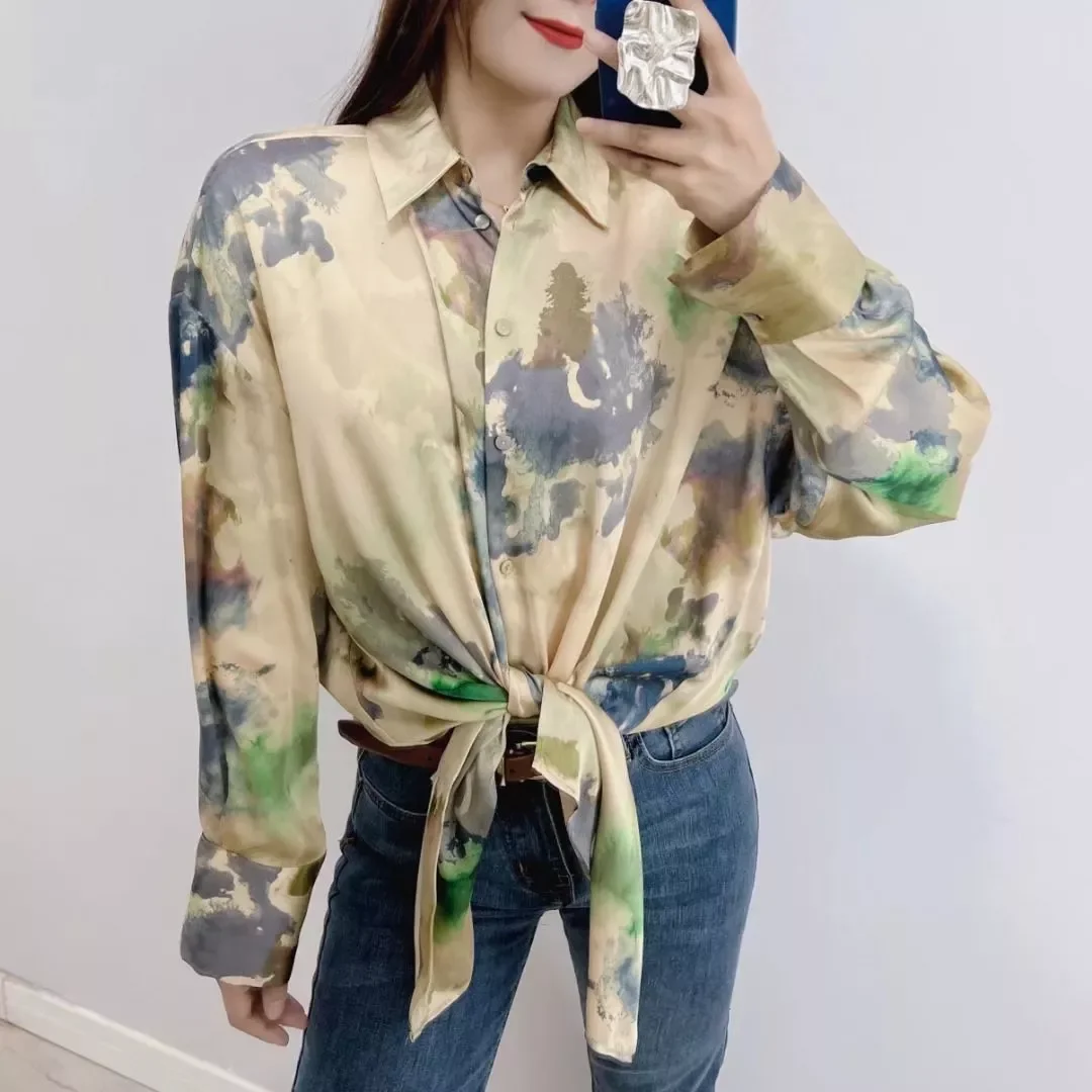 Блузка Женская атласная с отложным воротником и длинным рукавом, весна 2022