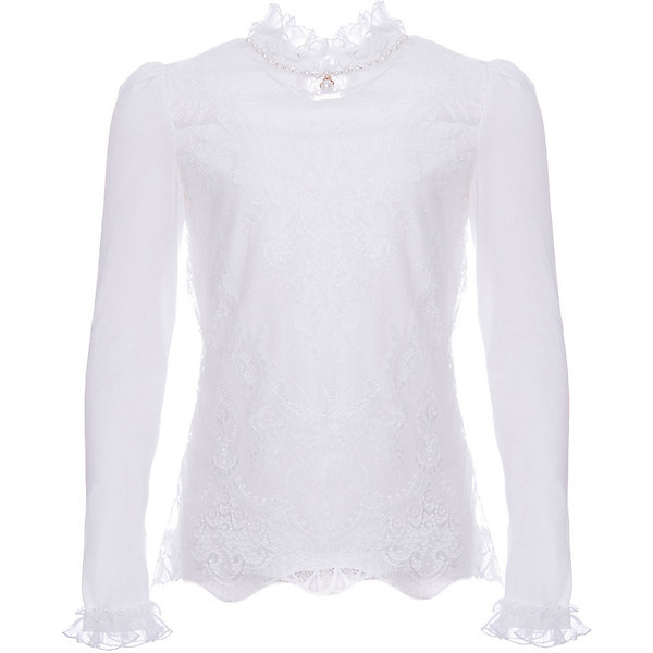Нарядная школьная блузка с длинным рукавом. Модель из хлопкового трикотажа. Горловина и низ рукавов украшены симпатичными рюшами. Лиф спереди выполнен из красивого кружевного полотна. На спинке вырез - капелька, застегивается на пуговицу.