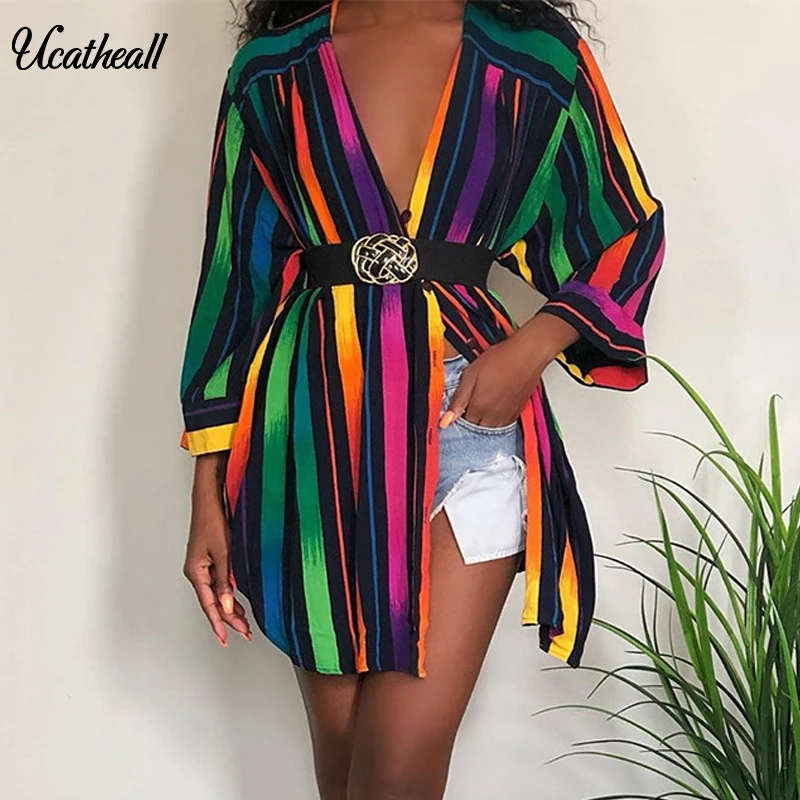 Блузка женская в разноцветную полоску, повседневный Топ с длинным рукавом, на пуговицах, свободного покроя, лето-осень