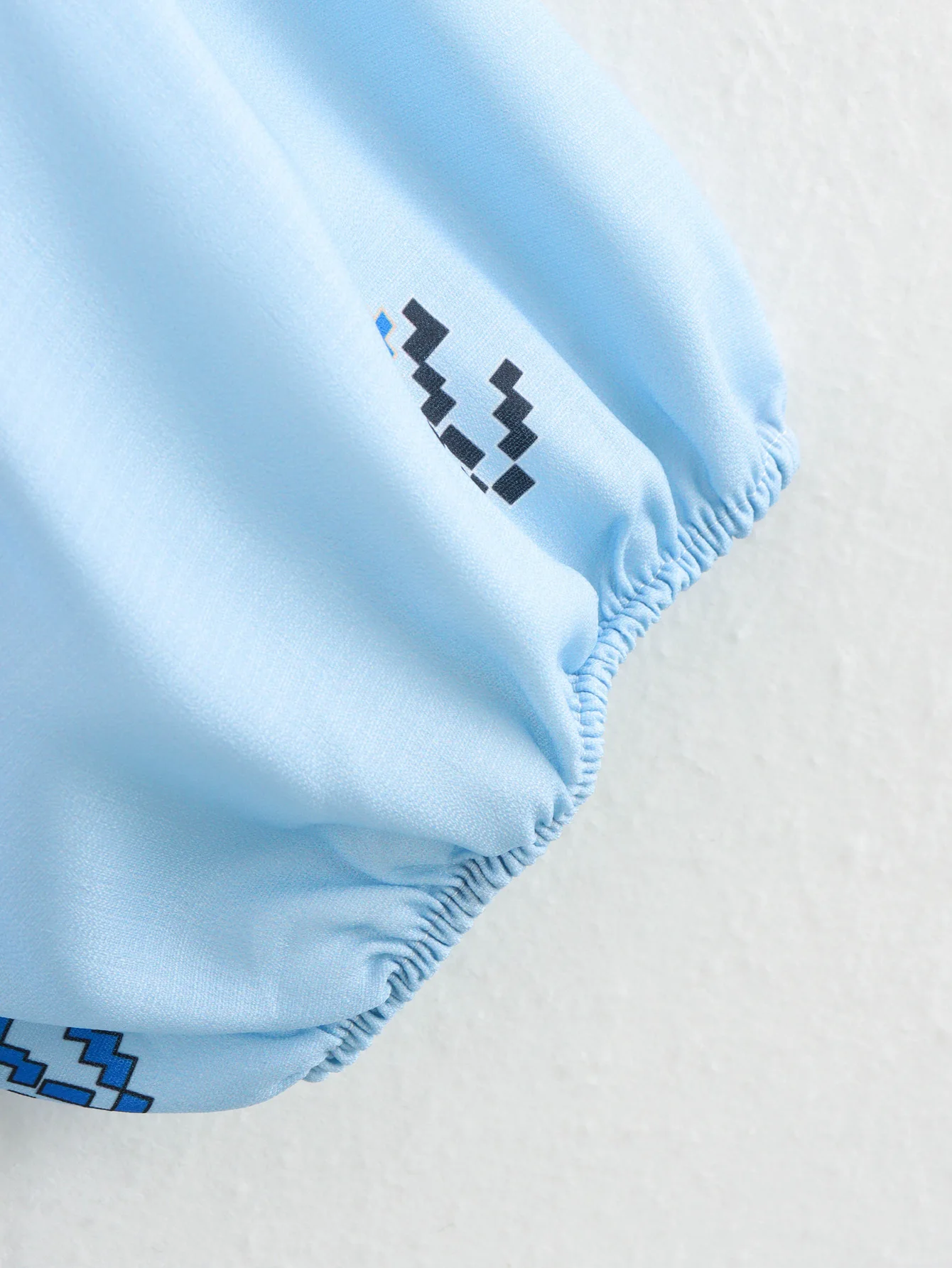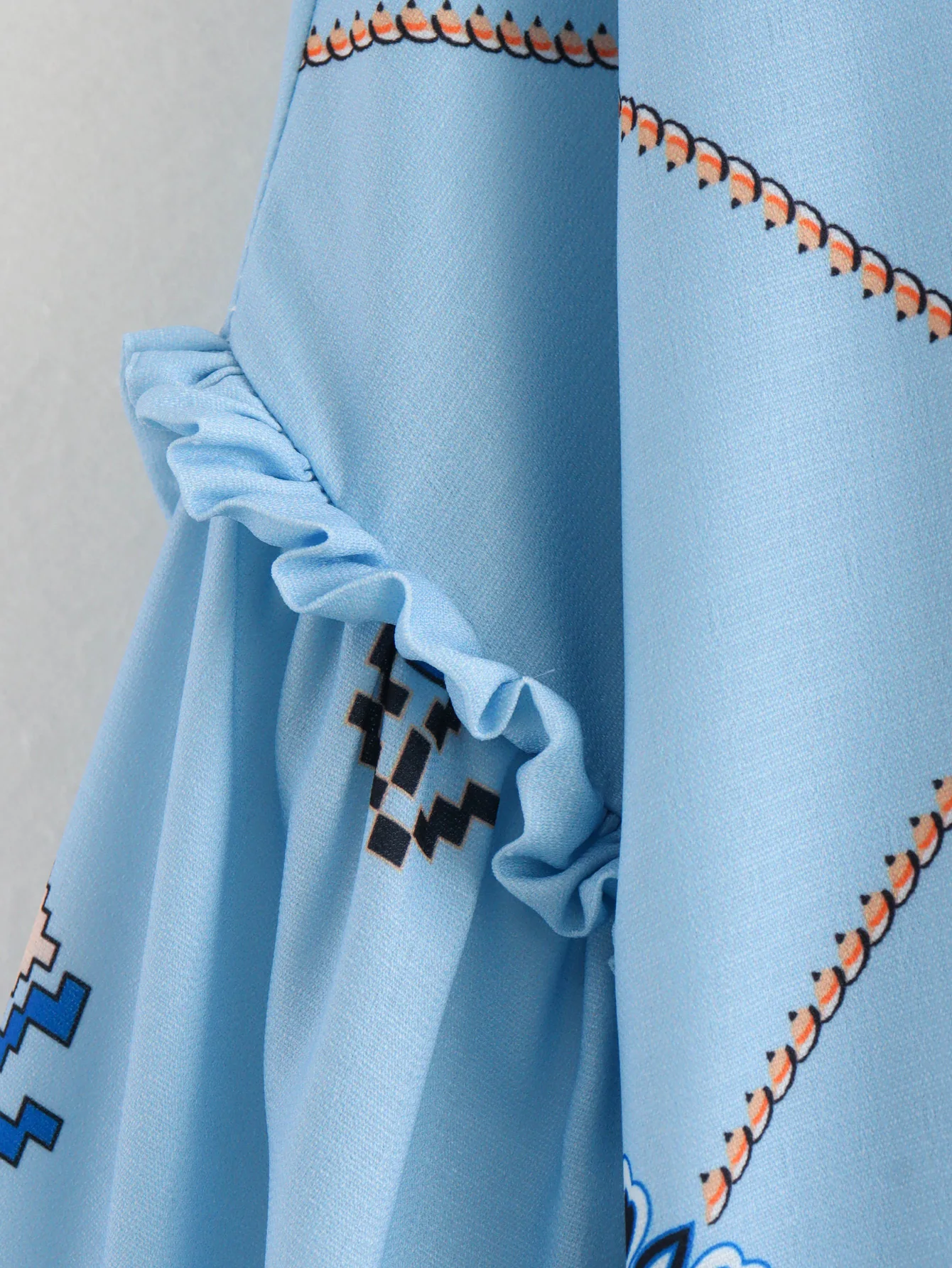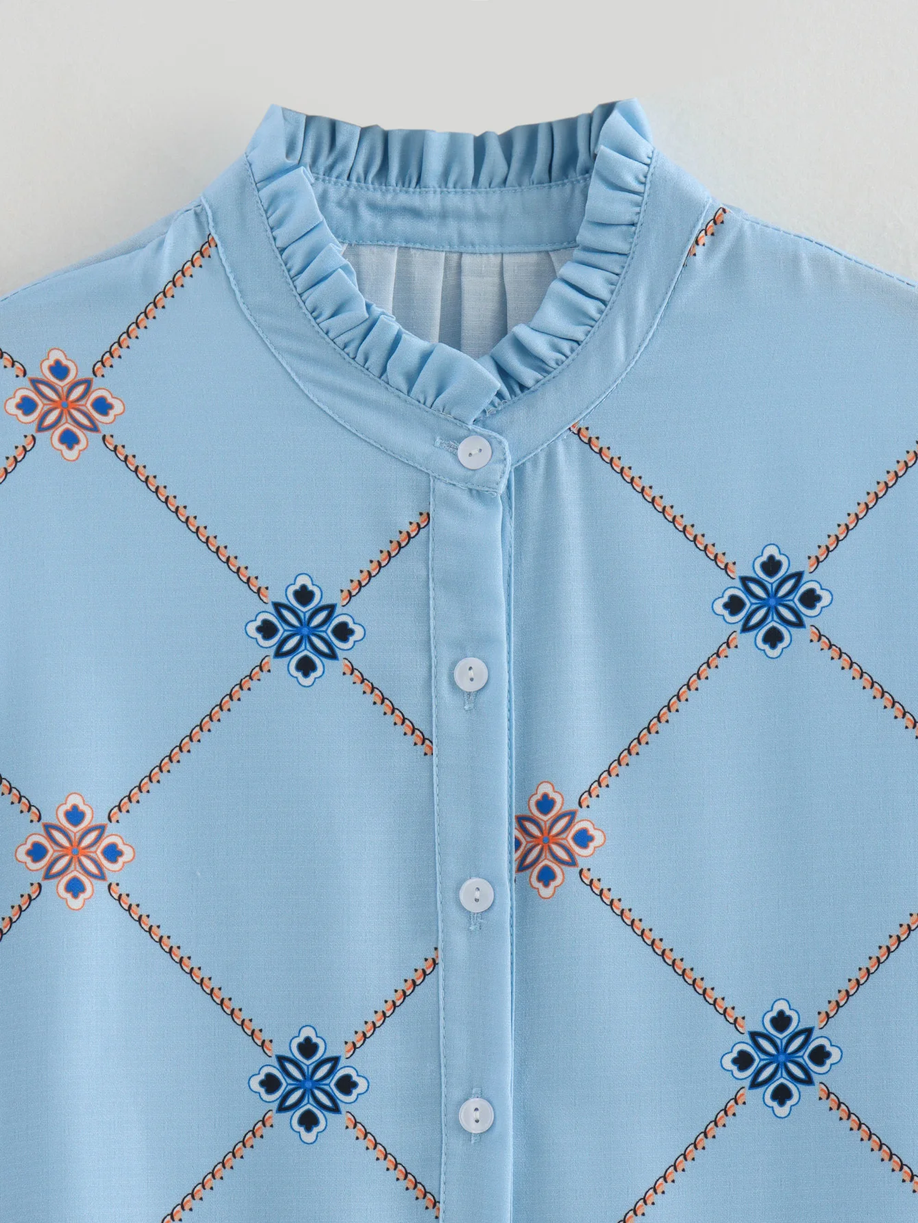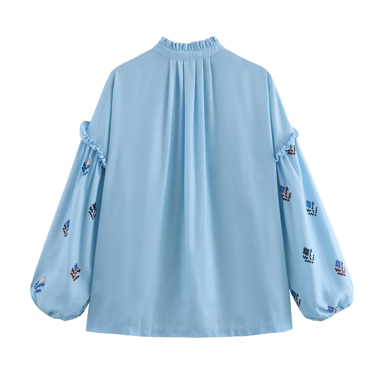 Блузка женская летняя голубая с воротником с оборками и длинными рукавами