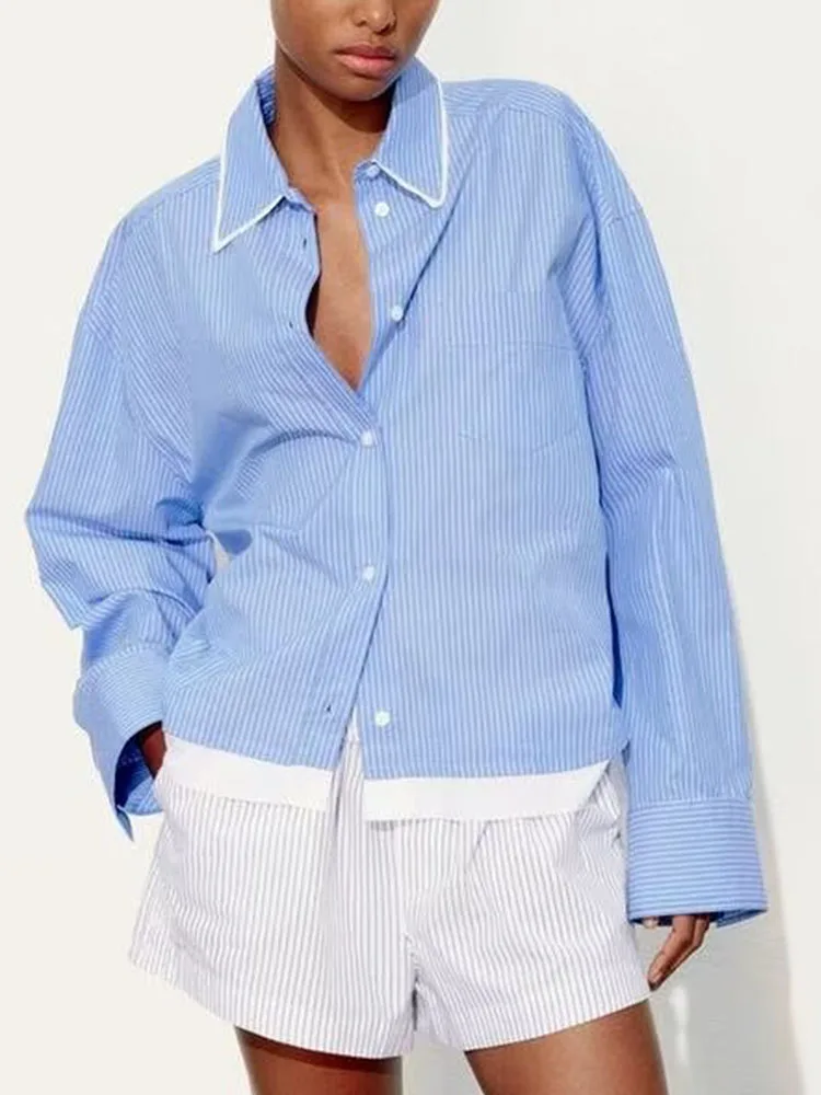 Блузка женская однобортная в полоску, с отложным воротником и длинным рукавом