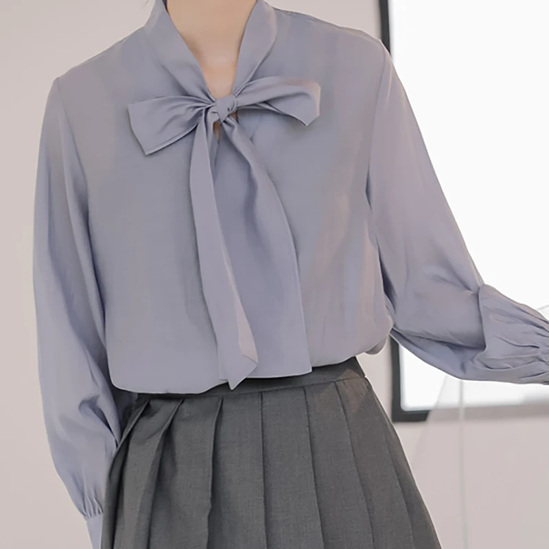 Блузка женская с бантом на шее, Свободный пуловер, винтажная Повседневная рубашка, однотонная базовая одежда, весна