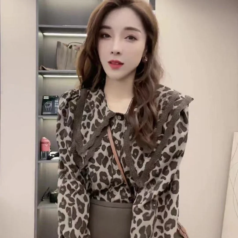Блузка женская с длинным рукавом и воротником-куклой, с леопардовым принтом