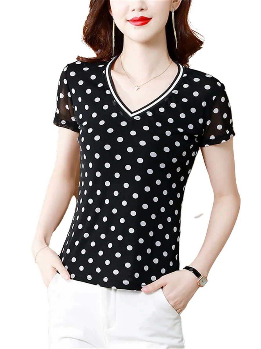 Блузка женская с коротким рукавом, V-образным вырезом и принтом в горошек