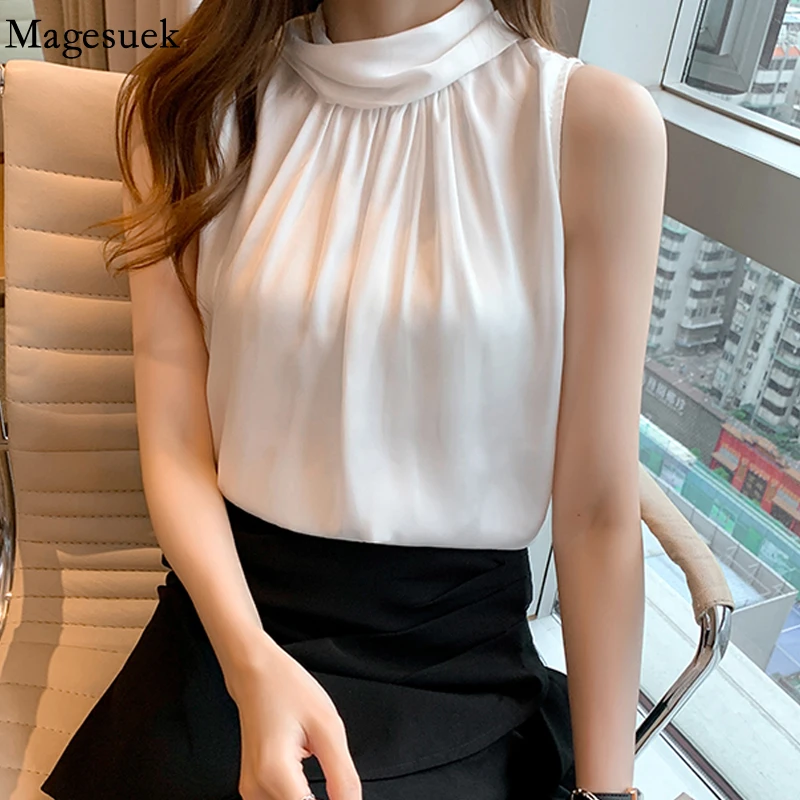 Блузка женская шифоновая без рукавов, с воротником-стойкой и бантом на спине