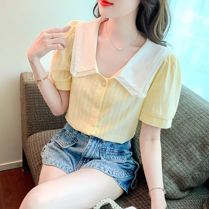 Блузка женская шифоновая с коротким рукавом и кукольным воротником