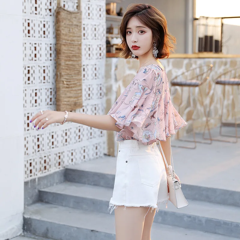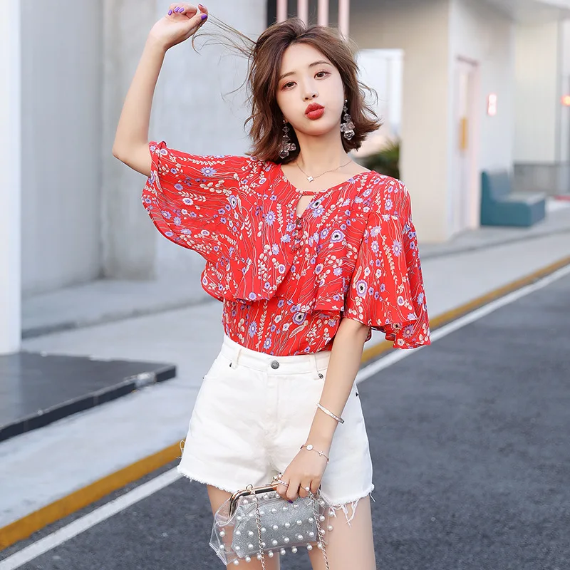 Блузка женская шифоновая с оборками, топ с коротким рукавом и принтом, D190704, лето 2019