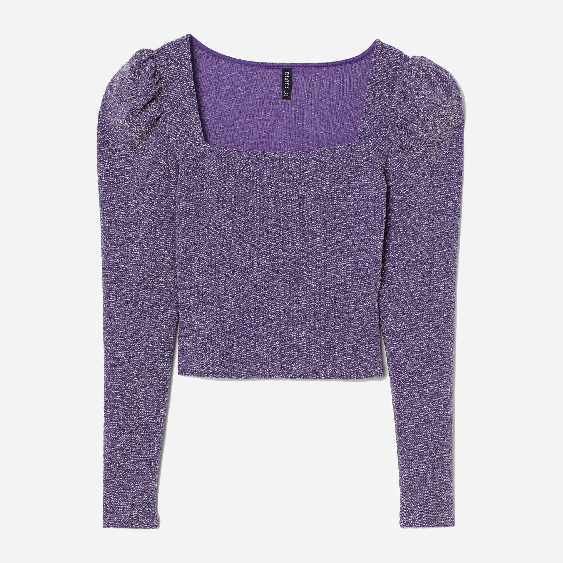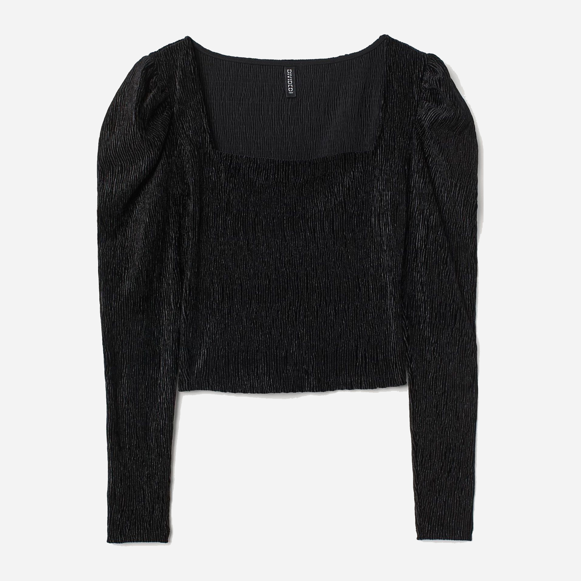 Особенности модели: Укороченный топ из плотного трикотажа с прямоугольным вырезом горловины.Длинные присборенные рукава.