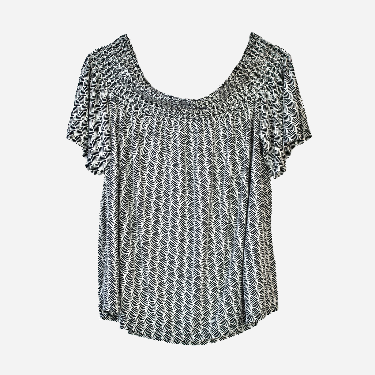Блуза из вискозного трикотажа. Спущенная линия плеча с резинкой. Короткий рукав.Возможно повреждение бирки.