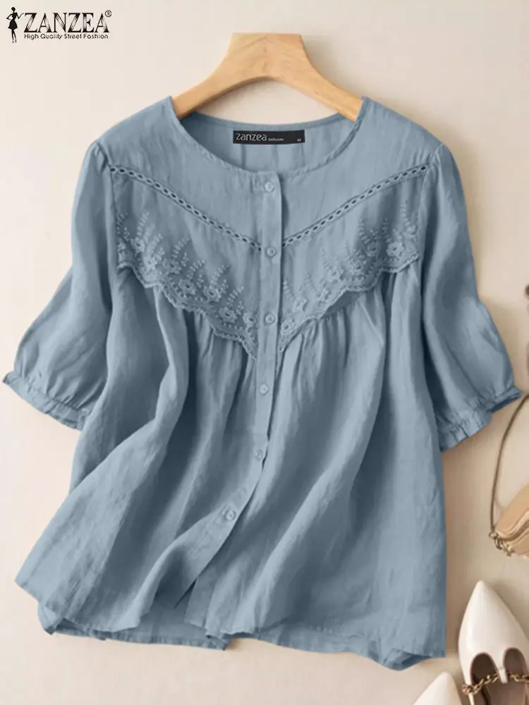Блузка ZANZEA Женская свободного покроя, с рукавом до локтя, на пуговицах, с кружевной вставкой, сетчатая, в винтажном стиле, лето 2024