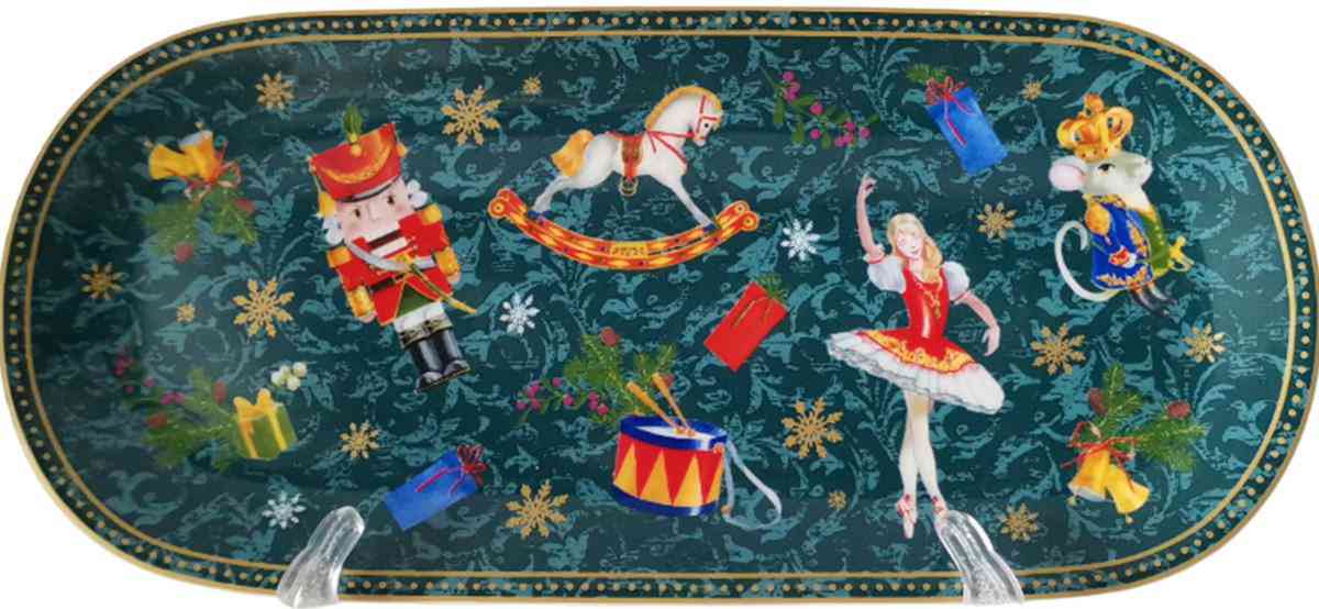 Блюдо овальное 25х11.5см из новогодней коллекции посуды Щелкунчик и мышиный король изготовлено из фарфора. В коллекцию входят кружка, чайная пара, кофейная пара, салатники, тарелки и блюда. Изделия можно использовать в СВЧ и ПММ.Срок годности не ограничен.