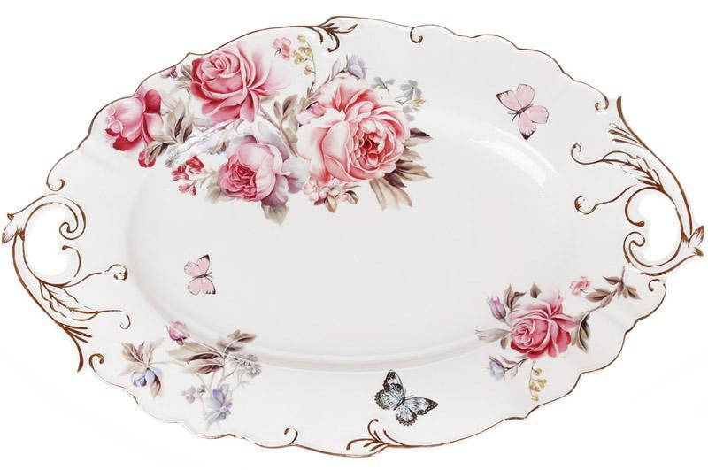 Блюдо овальное "Версаль" с ручками - роскошная коллекция фарфоровой сервировочной посуды в классическом французском стиле. Белый фарфор с нежным декором "Куст цветущей чайной розы", бабочка и тонкой золотой каймой. Размер: 36х24см, высота 3см. Универсальное сервировочное блюдо для праздничного и повседневного стола. Фарфоровое блюдо "Версаль" упаковано в белую картонную коробку.