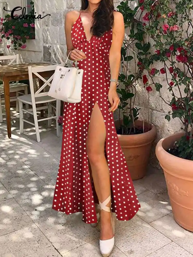 Богемный праздничный пляжный сарафан Celmia в горошек с Боковым Разрезом без рукавов сексуальное длинное платье с V-образным вырезом модное же...
