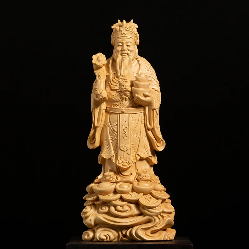 Бог богатства приближается 20 см, Китайская Скульптура Фэн-шуй из цельной древесины самшита