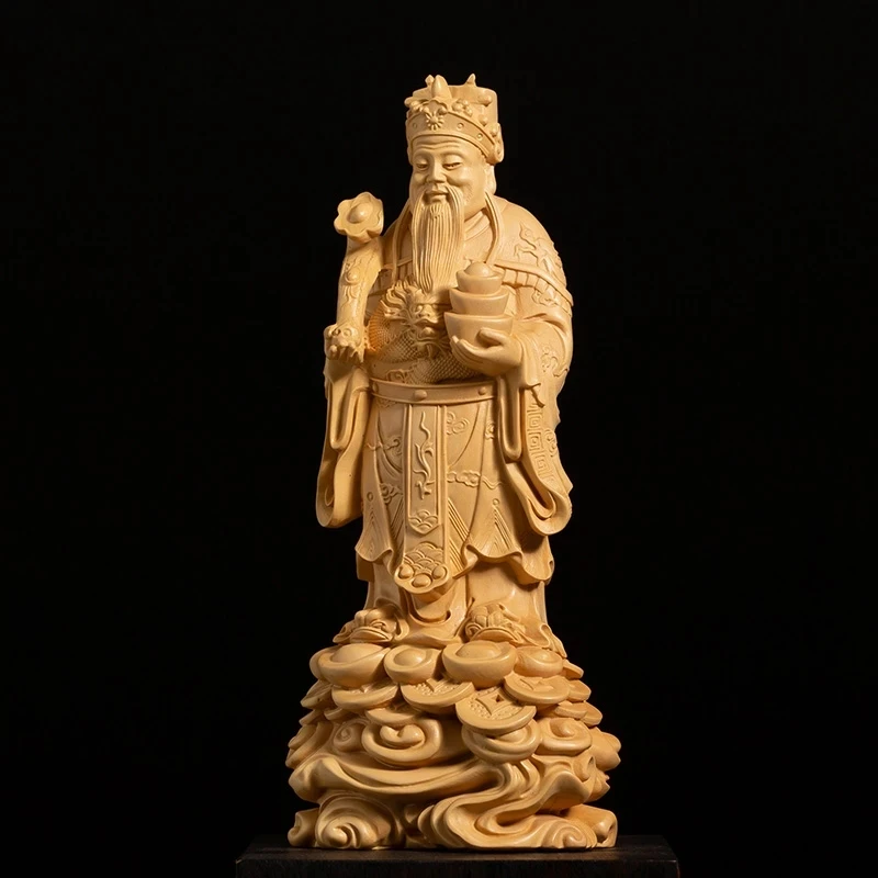 Бог богатства приближается 20 см, Китайская Скульптура Фэн-шуй из цельной древесины самшита