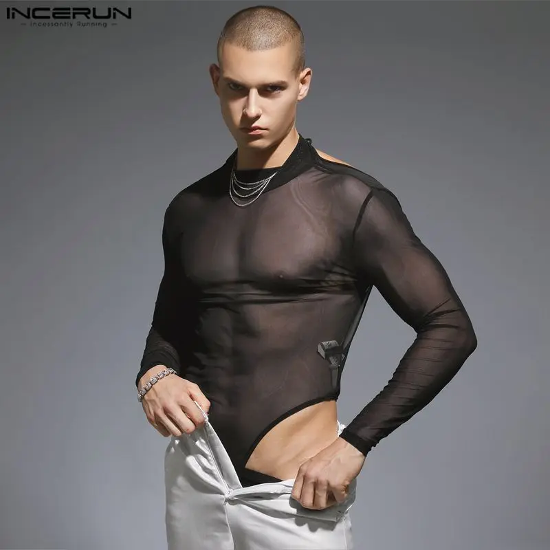 Боди мужское Сетчатое прозрачное однотонное с открытой спиной, круглым вырезом и длинным рукавом
