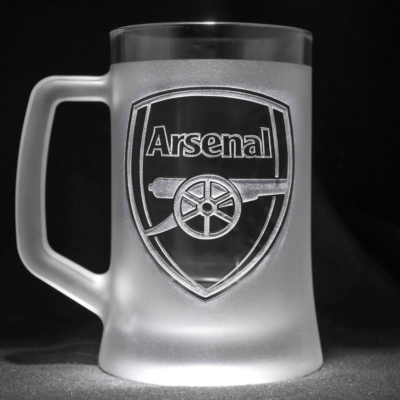 Стеклянная кружка для пива с ручной механической гравировкой логотипа футбольного клуба Арсенал, Arsenal FC в подарочной коробке