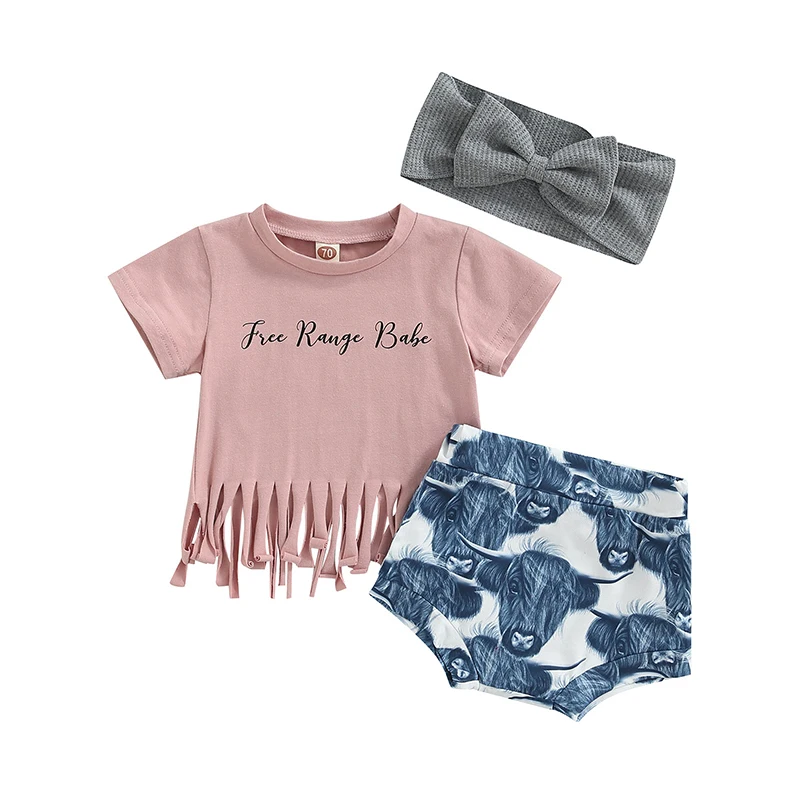Newborn Baby Girl Clothes Set 3Pcs Letter Print Short Sleeve Tassel T Shirts Cow Printed Shorts Outfits Headband