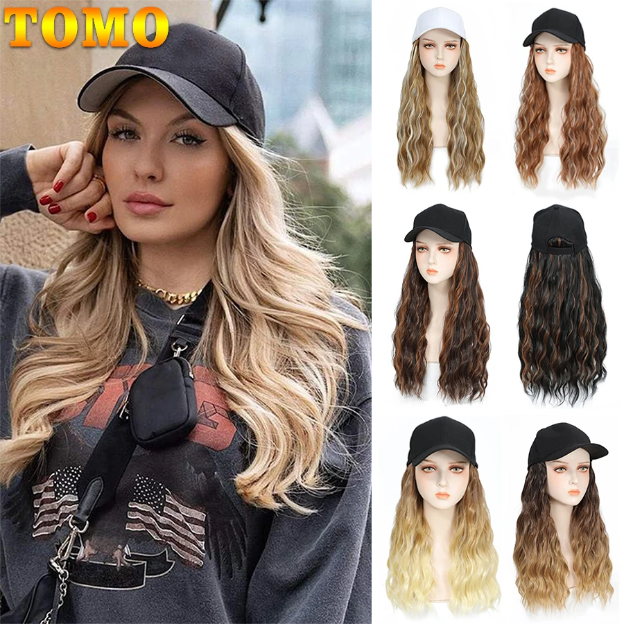TOMO Baseball Cap with Hair Extensions for Women Adjustable Hat with Synthetic Wig Attached 16inch Natural Wavy Hair