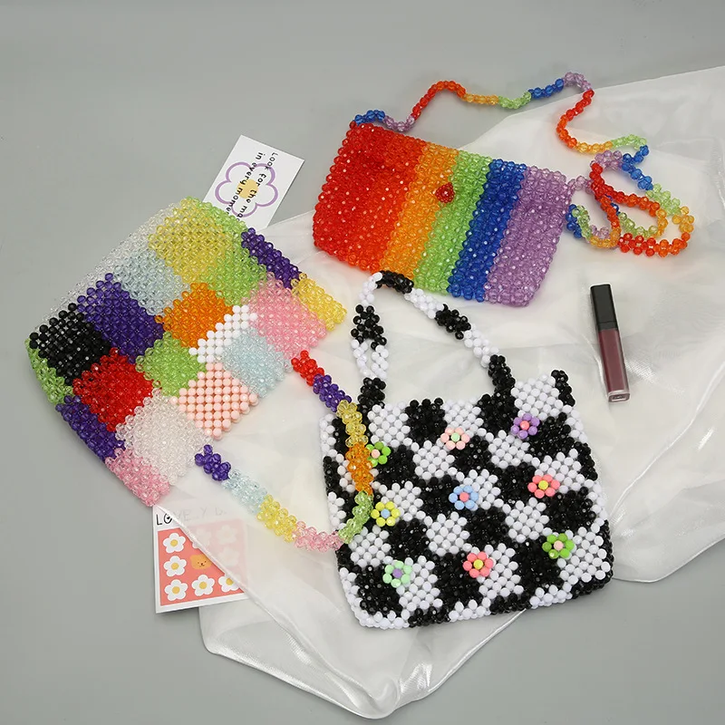 Большая Ручная сумка с радужным цветом, креативный саквояж на плечо ручной работы, тканая Сумочка с жемчугом, декоративный тоут с клапаном для хранения