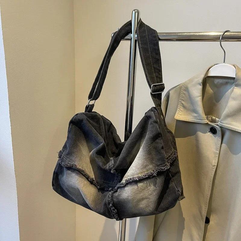 Большая вместимость однотонных корейских ретро-сумок-тоут из денима для поездок на работу, женская сумка через плечо, модная простая плиссированная сумка через плечо