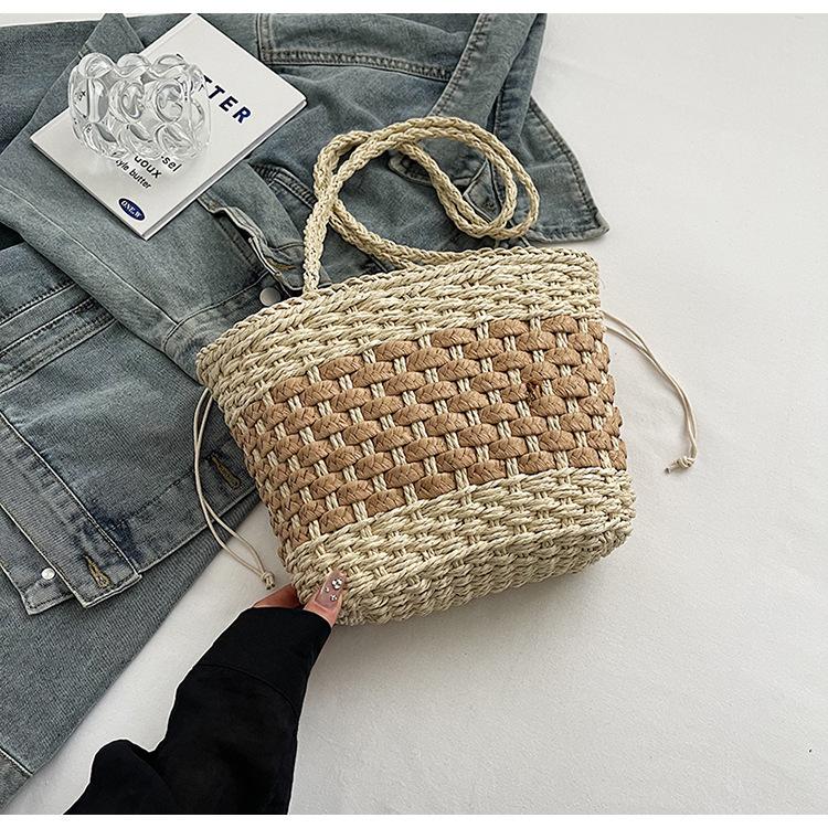 Большая вместительная соломенная сумка женская новая модная летняя универсальная сумка через плечо модная контрастная повседневная сумка-корзина для овощей бежевый