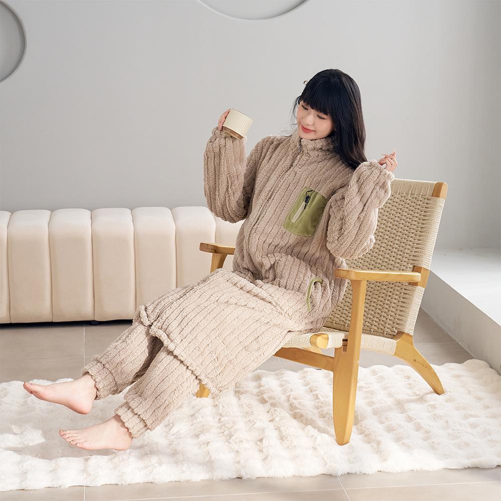 Большие размеры женские новые осенне-зимние длинные толстые теплые брюки из северной овечьей шерсти с длинным рукавом домашнее платье пижамный комплект XL хаки