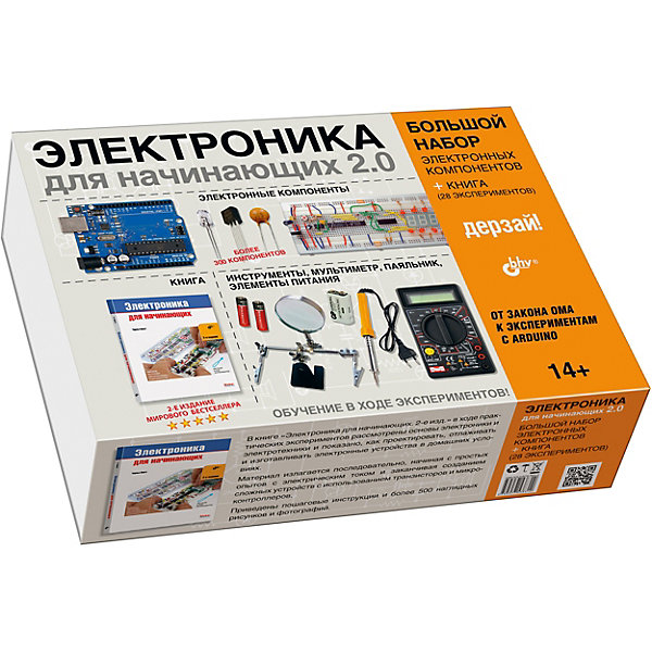 Данный комплект надолго увлечет вашего ребенка и и поможет получить полезные навыки по разработке электронных проектов. В процессе выполнения 28 экспериментов вы поймете что такое электрический ток, изучите на практике основные законы электричества, познакомитесь с принципом работы электронных компонентов и устройств от резисторов до интегральных микросхем, научитесь паять, соберете учебные и практические электрические схемы, создадите проекты с использованием платы Arduino, а также научитесь работать с мультиметром.