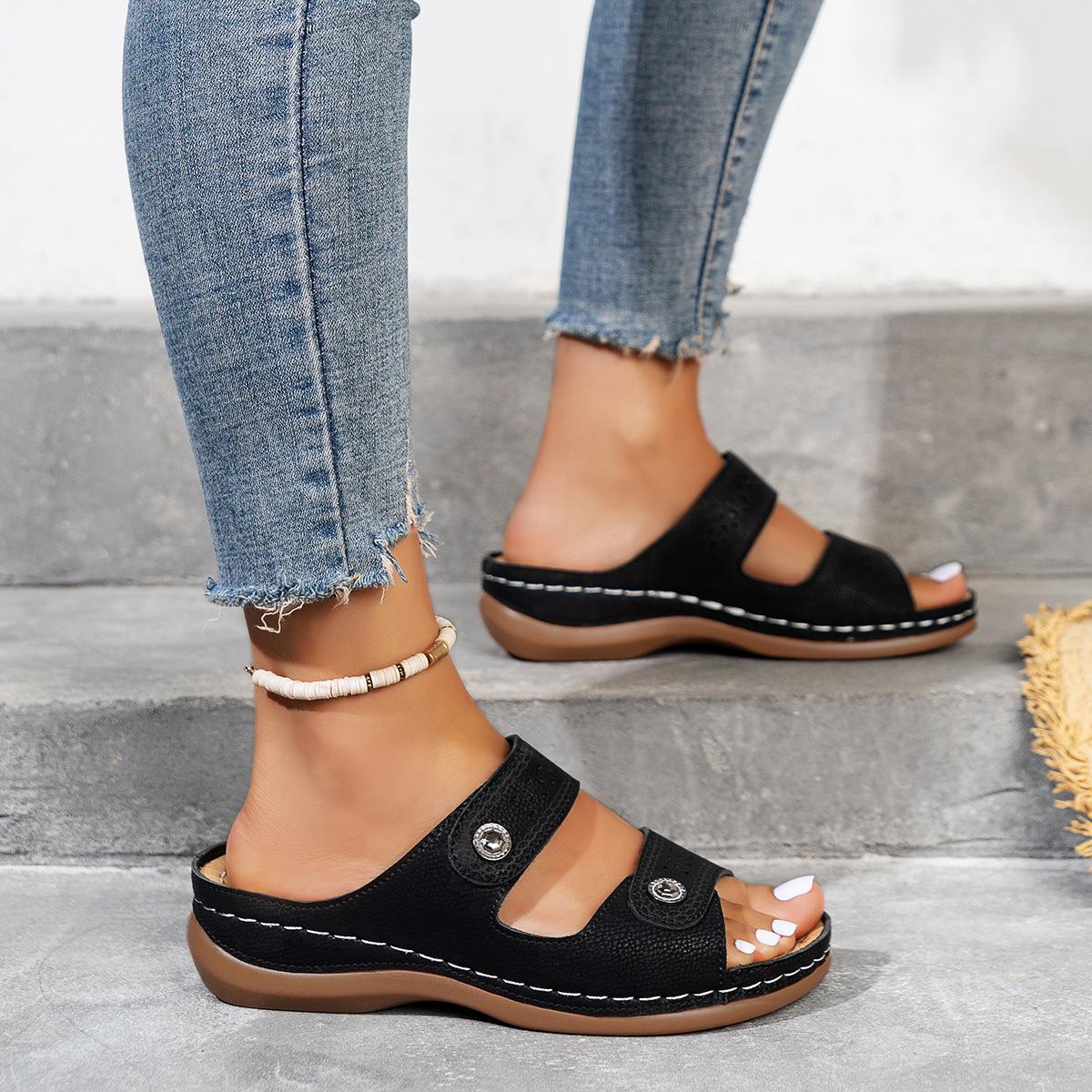 Большой размер полые ПУ толстоподошвенные шлепанцы женские ретро машинная строчка танкетка легкие пляжные прохладные шлепанцы ebay 35 чёрный