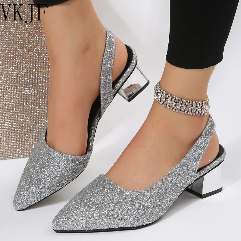 Босоножки женские на толстом каблуке, с острым носком, золотистые/Серебристые