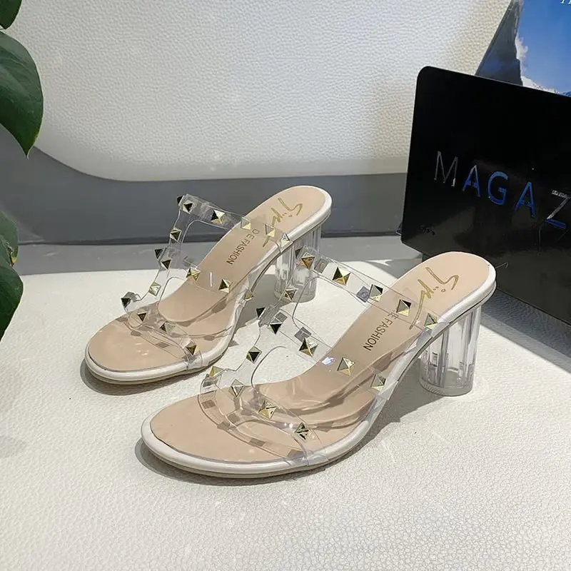 Босоножки женские прозрачные на высоком каблуке, пикантные сандалии с вырезами, с заклепками, вечерние офисные туфли, лето