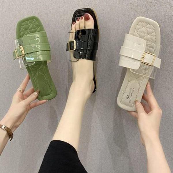 slipper female 2020 summer new one-line korean leather stitching fashion flat bottom women's shoes, Black