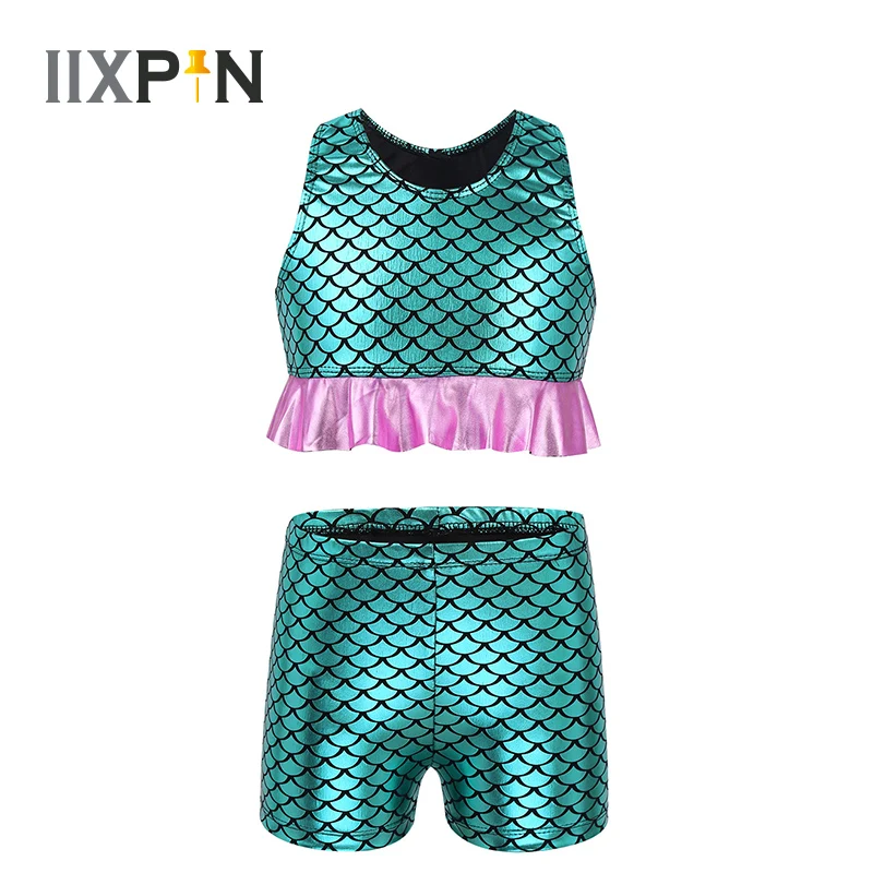Kids Girls Gymnastics Cheerleading Dance Costume Mermaid Fish Scales Printed Racer Back Peplum Crop Tops with Boy-cut Shorts